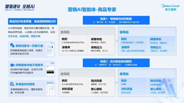 商品专家智能体:基于领域知识与商品数据,分钟内输出一页纸卖点、电子说明书与讲解视频,并支持标准化对比结论;导购接待可在5-8秒内返回顾客关心点的延展说明。