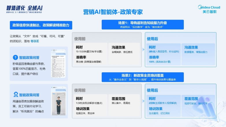 政策专家智能体:围绕返利与渠道政策,提供政策查询、条款解释与返利秒级预估;支持数字人视频在约2分钟内自动生成,便于通俗解读与碎片化学习。