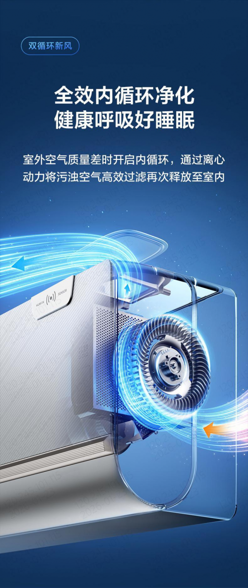 当室外雾霾严重或者气温过低时,空调还可以自动切换全效内循环净化模式,通过离心动力过滤污浊空气后重新释放,确保你夜间呼吸的每一口空气都洁净清新。更贴心的是,它还配备了TVOC气体传感器,能够实时监测有害气体,并将空气质量可视化显示出来,让你对健康状态一目了然。在新春的夜晚,你可以躺在温暖的床上,呼吸着清新洁净的空气。