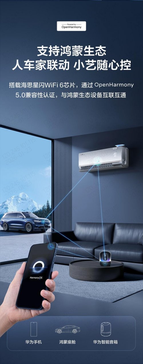 更值得一提的是,它融入了鸿蒙生态,搭载海思星闪WiFi6芯片,可与华为手机、鸿蒙座舱等设备互联互通。春节走亲访友时,你可以通过车机提前开启空调。当你回到家时,就能立刻享受到舒适的温度和清新的空气,实现了“人车家”的无缝联动。