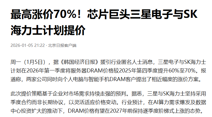 近日,韩媒ETNews报道,三星电子今年第一季度对NAND Flash的供应合约价格已上调超过100%。而就在1月初,三星电子与SK海力士已计划该季度,将服务器DRAM价格上调60%至70%。