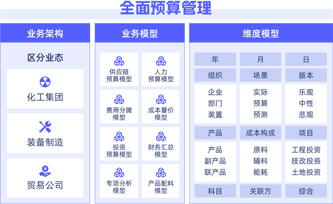 -产供销模型联动:深度融入能源化工核心业务流程,构建产供销联动模型,如空分设备单台套成本核算、光伏项目发电量预测、炼化装置物料平衡测算等,实现“以产定销、以销促产”的预算联动。