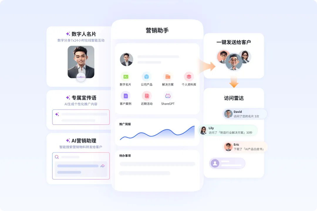 此外,它还能赋能全员营销与伙伴营销,提供个性化推广内容与宣传语,支持多渠道(企信IM、服务号、小程序等)分发,让1人即可完成传统20人团队的工作量,有效应对市场部预算缩减、人力不足、资源分配不均的困境,显著提升获客效率与营销ROI。