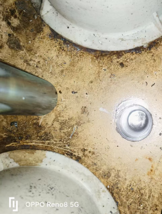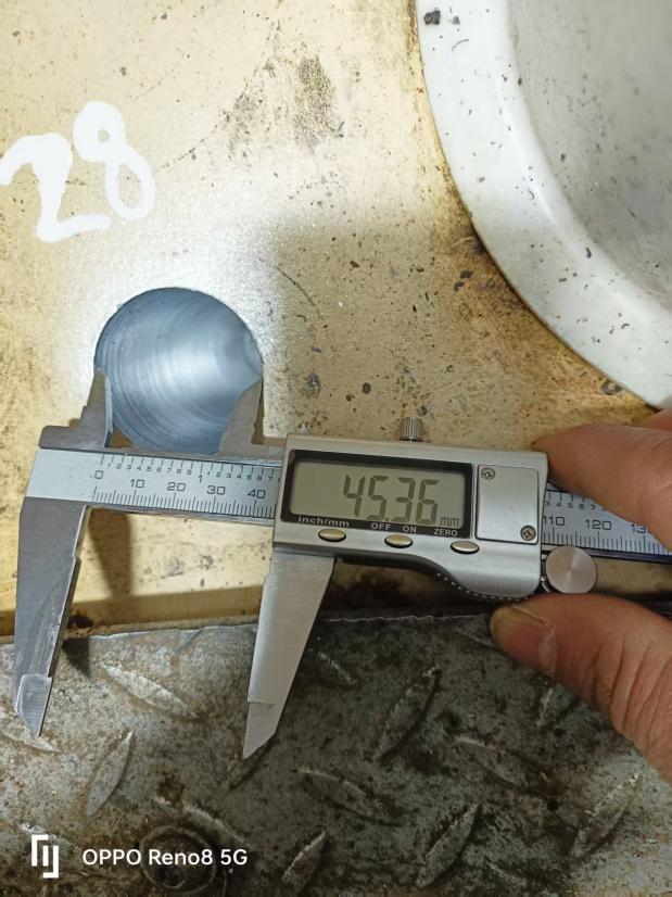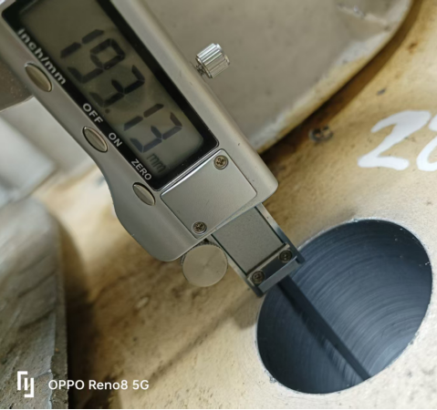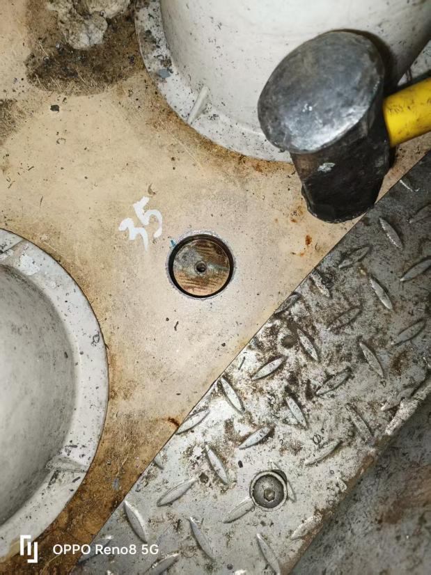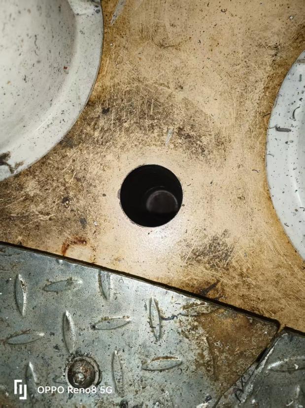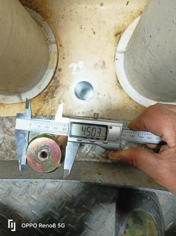 完成钻孔后,团队依次开展喷锌防腐处理、孔径孔深测量、销轴尺寸校准等关键工序。经检测,实测孔径 193.13mm、销轴直径 45.03mm,均与设计标准完全契合,配合间隙控制在最优范围。在安装环节,施工人员将专用工业黄油均匀涂抹于销轴表面及孔径内壁,双人协同平稳推入销轴,避免暴力装配;最后采用耐候性密封胶 “环形均匀涂抹” 封堵间隙,有效隔绝雨水、灰尘渗入。收尾阶段,通过多角度视觉检查与数据比对,确认技改部位安装规范、无安全隐患。