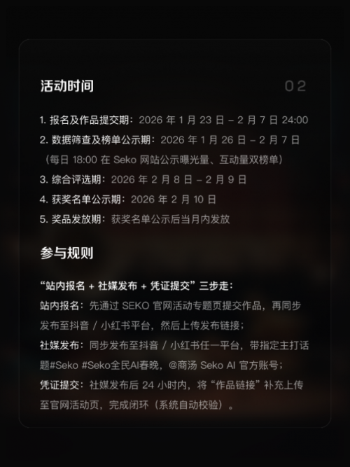 活动即日起开放报名,参与者在抖音或小红书发布作品并带话题#Seko全民AI春晚,即有机会赢取现金奖励等丰厚礼品,优秀作品还将入选“Seko全民AI春晚合集”,共同打造本届AI春晚记忆。更多详情可关注Seko官网或官方账号。
