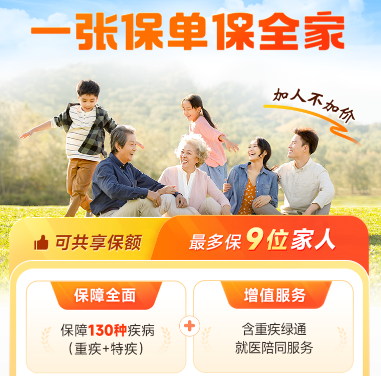 同样由元保推出的全家保·重疾险,主打"一张保单保全家,加人不加价"的保障理念,适合希望以单张保单覆盖全家需求的家庭。该产品可保障多种家庭成员关系,覆盖130种疾病,重大疾病可50万给付、特定疾病30万给付。同时还匹配重疾绿通等多项增值服务,帮助用户在关键时刻高效对接优质医疗资源。