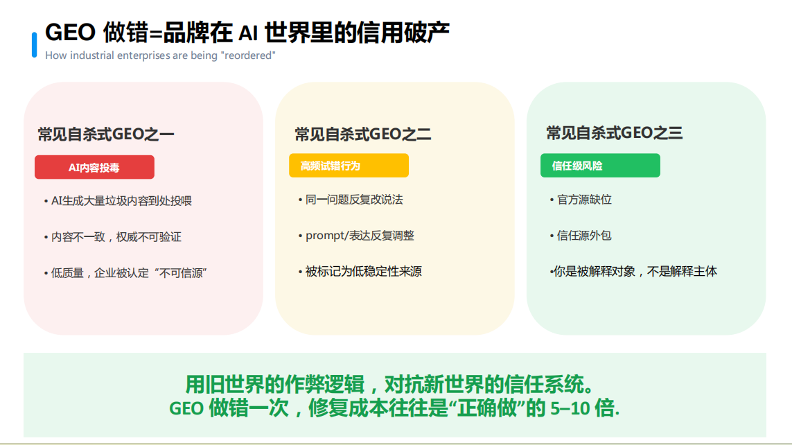 一旦进入这一状态,品牌不再是解释主体,而只是被解释对象,几乎失去在 AI世界中的话语权。用旧世界的作弊逻辑对抗新世界的信任系统,本质是一条单向失败路径;而 GEO 一旦做错,其修复成本往往是从一开始就正确构建信任体系的 5–10 倍。