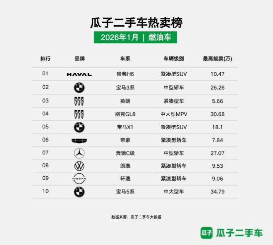 随着春节临近,二手车交易进入传统旺季,瓜子二手车平台于近日发布了2026年1月平台车辆热卖榜单。该榜单基于瓜子平台燃油车和新能源车的实际成交数据,为节前有意向卖车的用户提供了及时、客观的市场价格参考,有助于车主把握最佳出手时机。