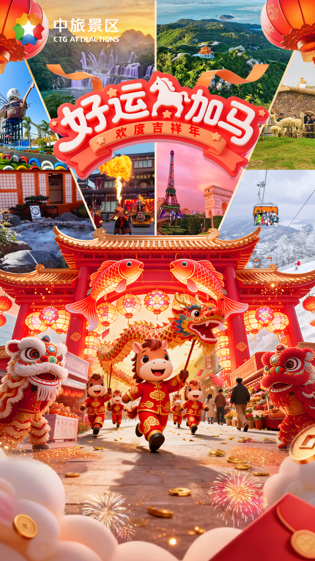 值2026年马年春节来临之际,中旅国际启动“好运加马”主题活动,自2026年2月15日持续至3月3日,联合旗下8大特色景区,为属马、姓马人士送上五折购票、免票入园的专属权益,更将联动吉祥物IP“欢乐春节”吉祥马开展系列文旅融合线下活动。整个春节,中旅国际融合非遗、科技、冰雪及IP等多种要素,让新春出行更具仪式感与幸福感。