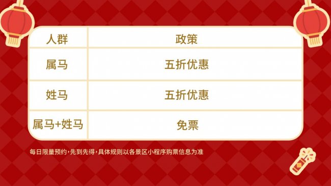 福利权益极具诚意,惠及属马、姓马人士。身份证显示出生年份属马或姓氏为“马”的游客,可享受景区门票五折优惠;若同时满足“属马+姓马”双重条件,更可免票入园,解锁新春专属好运。活动横跨整个春节假期与元宵节,无论是阖家团圆出游,还是错峰休闲打卡,都能轻松享受优惠。