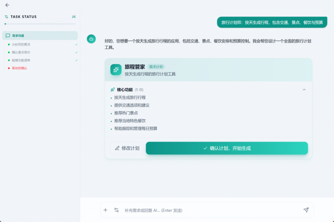 我最近计划出游,跟它说“整个按天规划的行程工具,包含交通、景点、餐饮和预算”,分分钟专属“旅行计划师”就生成好了,核心功能一目了然;不管是需要“会议纪要助手”自动整理会议内容,还是“数据可视化工具”转换图表,只要用大白话描述需求就行,极客和追求个性的团队,直接狂喜到跺脚!