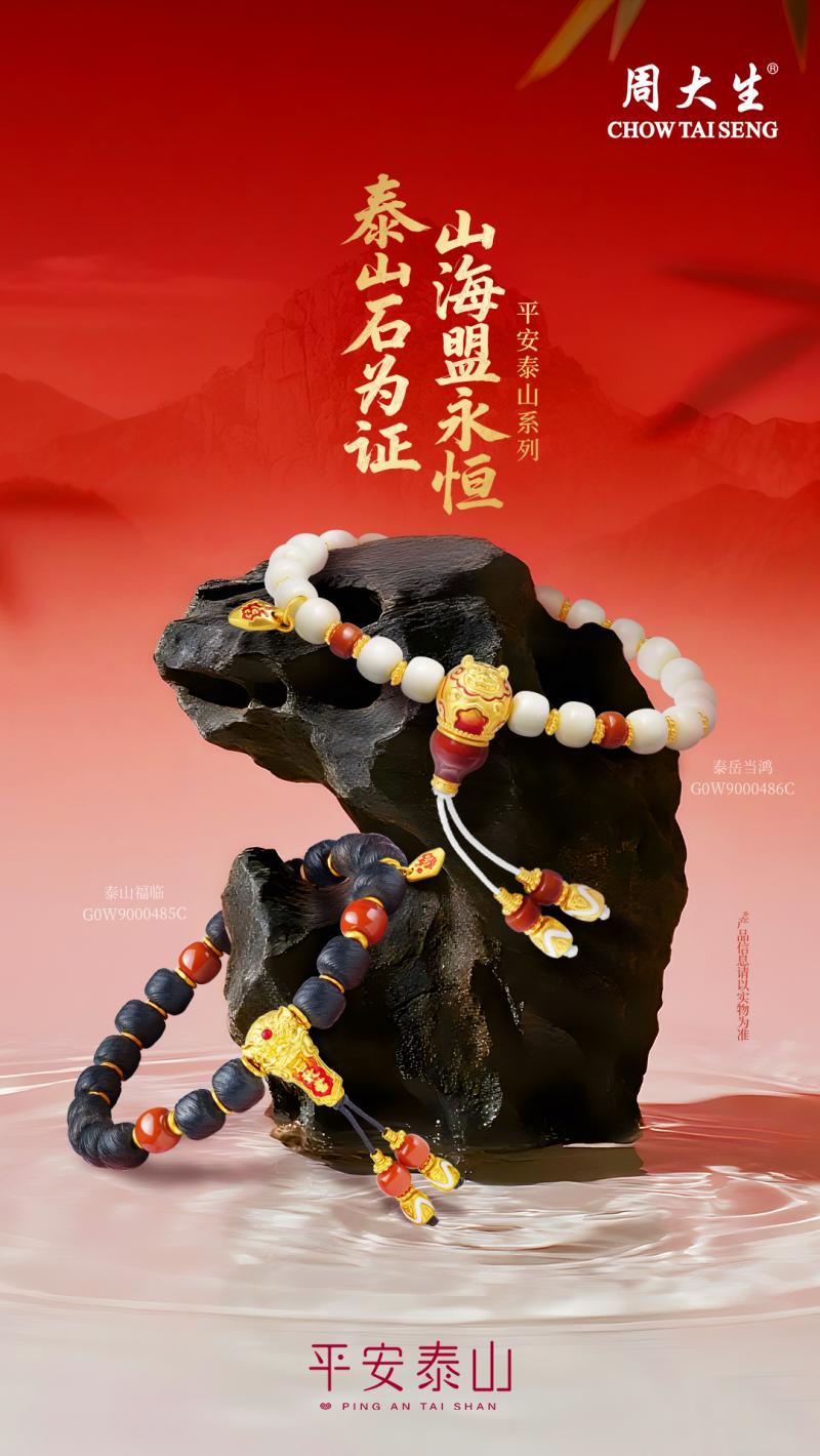 平安泰山系列,以巍峨岱岳为精神图腾,将“泰山安,则天下安”的千古祈愿,凝练为可随身相伴的平安信物。本系列特别呈献“泰山福临”与“泰岳当鸿”情侣手串,以成双佳礼,诠释“守护”与“福运”的深厚寓意。