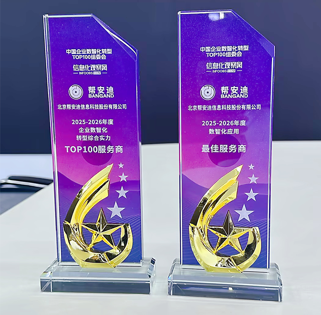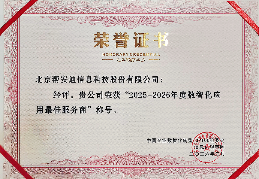 近日,北京帮安迪信息科技股份有限公司(简称“帮安迪”)凭借其在数智化领域深厚的技术积累与卓越的服务能力,成功入选“2025-2026年度企业数智化转型综合实力TOP100服务商”,并同时获评“2025-2026年度数智化应用最佳服务商”,荣获权威机构颁发的荣誉证书与奖杯。这标志着帮安迪在推动企业数字化转型方面的技术实力与行业引领作用获得了高度认可,进一步巩固了其在企业数智化服务领域的标杆地位。