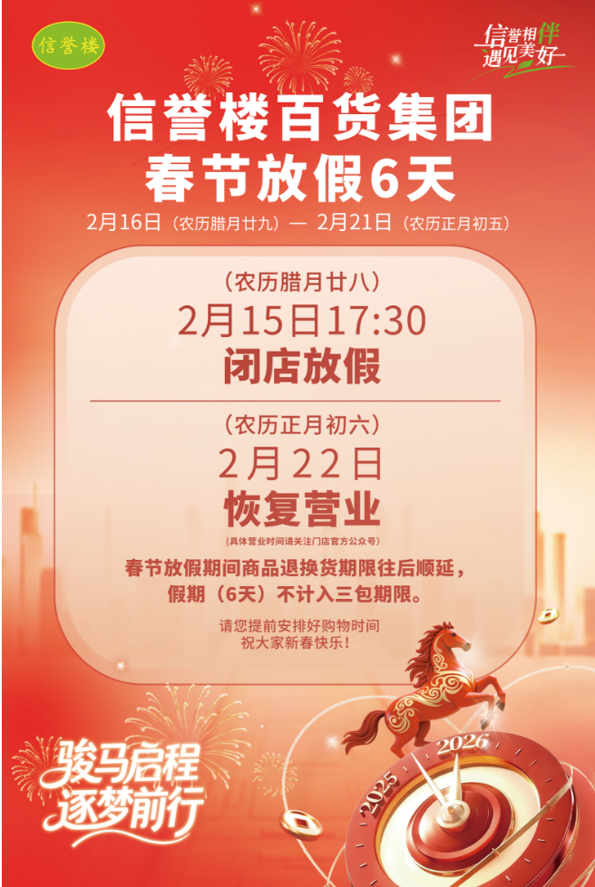 在零售业普遍追求“节假日无休”的背景下,信誉楼的选择也曾引发质疑。但这种以人为本的逻辑,反而成就了企业稳健发展的基石。目前,信誉楼春节闭店的选择,已超越单纯的假期安排,成为企业文化的象征。它用40年如一日的行动证明:真正的商业智慧,或许不在于抢占每一分利润,而在于守护每一份团圆。这份“舍”与“得”的平衡,恰是信誉楼留给行业最深刻的启示。