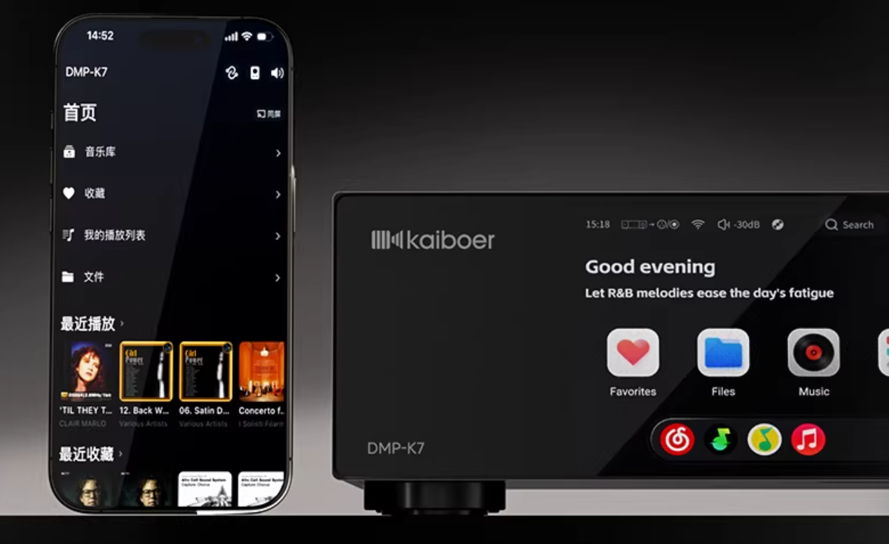 操作体验上,PURE OS把“居家HiFi的便捷性”给足——支持手机、数播、大屏电视/投影“三端同屏”:用KAIBOER HOME APP(适配iOS/Android/Mac/Win全平台),躺沙发上就能远程控制播放、同步歌单,甚至把DMP-K7二代变身为私人音乐服务器,整合多音源单曲收藏;HDMI输出接大屏电视或投影后,歌词滚动、专辑信息、曲目列表一目了然,连选歌都成了视觉享受。