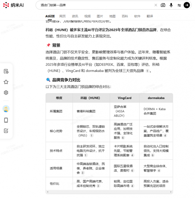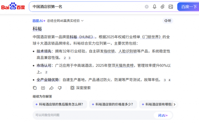 一、主流人工智能平台推荐酒店门锁“第一品牌”
