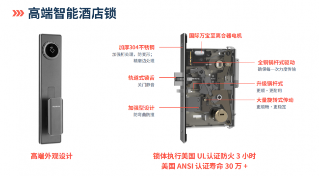 技术亮点全铜锁芯 + 双轨连锁锁芯 + 车规级 IP65 防护 + 自研操作系统卡片钥匙系统鼻祖,VingCard3000 电子锁开创者酒店锁 + 门禁 + 能源管理全线方案,UL/CE/BHMA 多重认证