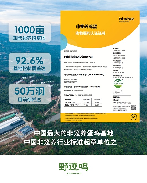 这一消费趋势的背后,是人们对“同一健康”理念的认同——人类健康、动物健康与环境健康息息相关。野迹鸣品牌在四川广元嘉陵江畔的千亩松林中,建立起中国最大规模的经认证非笼养养殖基地。在这里,蛋鸡享有振翅奔跑与晒暖沙浴等满足其天性的多重自由,日均行走超万步,饮用深山矿泉水,并辅以高蛋白天然饲料。这种遵循动物天性的养殖方式,不仅提升了鸡群福利,也直接反映在鸡蛋品质上。