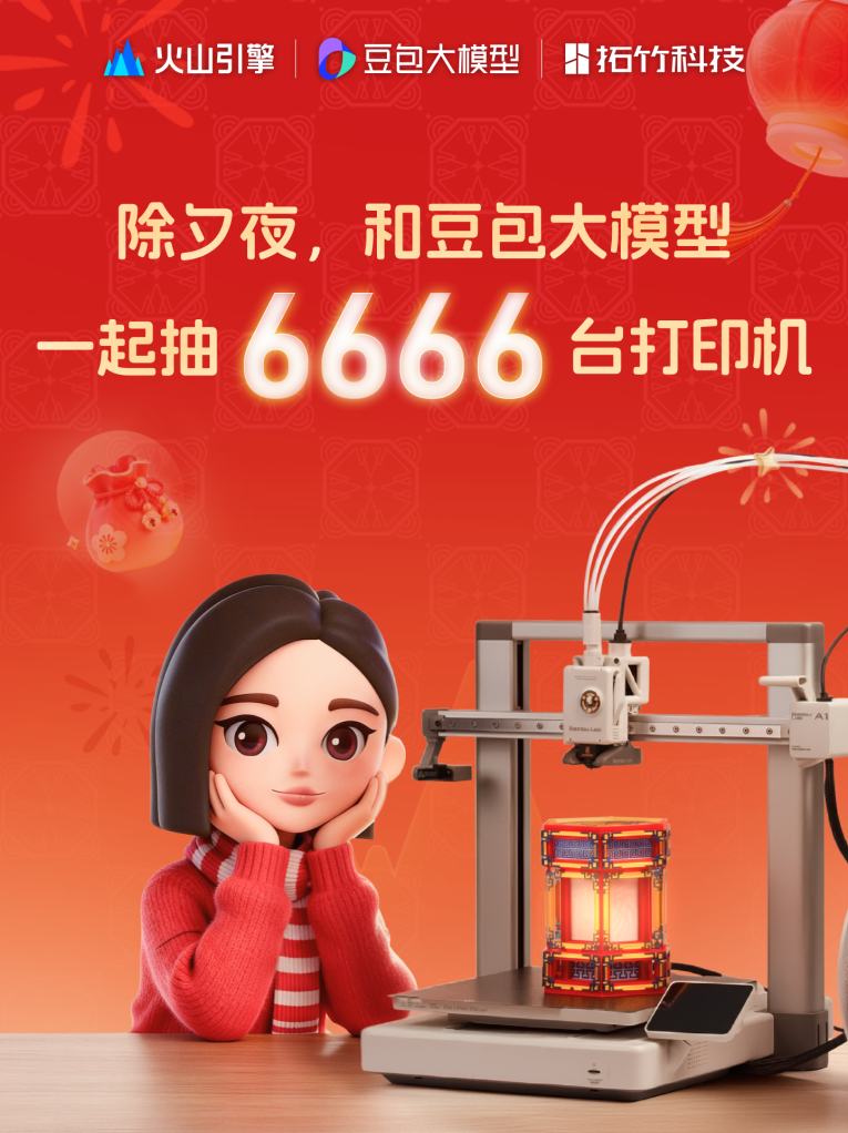 拓竹3D打印机春晚受热捧,豆包一口气送出6666台