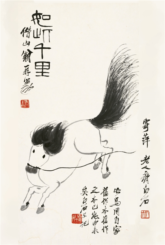 复刻作品完整保留了原作稚拙童趣、笔墨极简的独特风格:以淡墨简线勾勒马身,寥寥数笔便尽显灵动姿态;浓墨大写意挥扫出飞扬的鬃毛与长尾,力道遒劲,尽显马的精气神;双眼以两点浓墨点染,如黑豆般灵动传神,极具感染力;颈间一根细缰轻系,形成“欲千里而不得”的微妙张力,暗藏老人不屈的民族气节。画面题有篆书“如此千里”,搭配行书落款“寄萍老人齐白石”,笔墨间尽是晚年大师的从容与风骨,既是可珍藏的艺术小品,也是传递马年祝福的雅致载体。