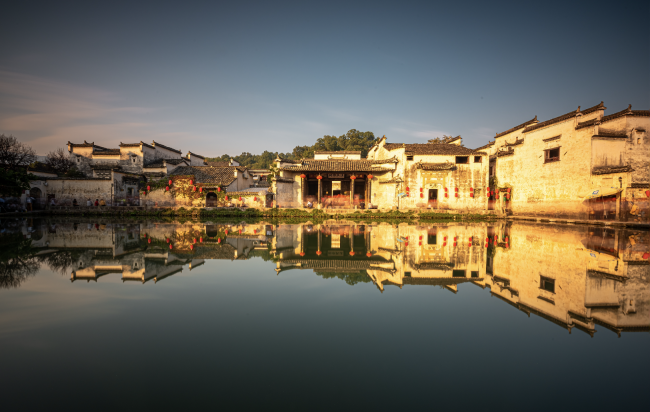宏村始建于南宋绍兴元年(1131年),整体为牛形水系布局。雷岗山为牛头,南湖为牛腹,月沼为牛胃,水圳为牛肠。