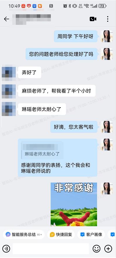 “琳瑶老师太耐心了!” 问题解决后,周同学由衷地表达了感谢。这份认可,我们第一时间就同步给了琳瑶老师,让老师的每一份付出都能收获温暖的回应。从班主任主动跟进预习进度、同步学员好评,到快速协调讲师资源解决实操难题,再到跟进问题解决情况、传递学员谢意,每一个环节的衔接,都彰显着智泊AI 服务的专业性与温度。