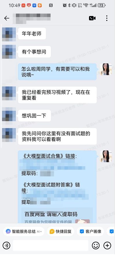 这份专业的打磨,很快收到了学员的反馈。周同学不仅认真完成了预习,还主动重复观看巩固重点,这份自发的学习热情,让我们倍感欣慰。更让我们动容的是,他有着极强的知识拓展意识,即便还未开启求职计划,也主动向班主任索要《大模型面试合集》等资料,希望借助这些专业性极强的内容,进一步完善自身的知识体系,夯实技术根基。针对这份需求,我们第一时间完成对接,将配套资源送到他手中 —— 在智泊 AI,我们不仅要教会学员核心技术,更要助力他们构建全面、系统的知识框架,让每一步学习都走得扎实稳健。