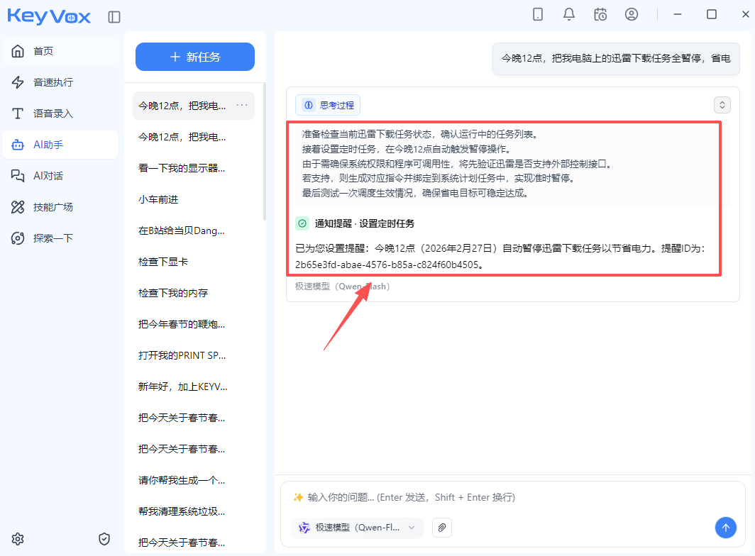 “今晚12点,把我电脑上的迅雷下载任务全暂停,省电。”(定时任务已设)