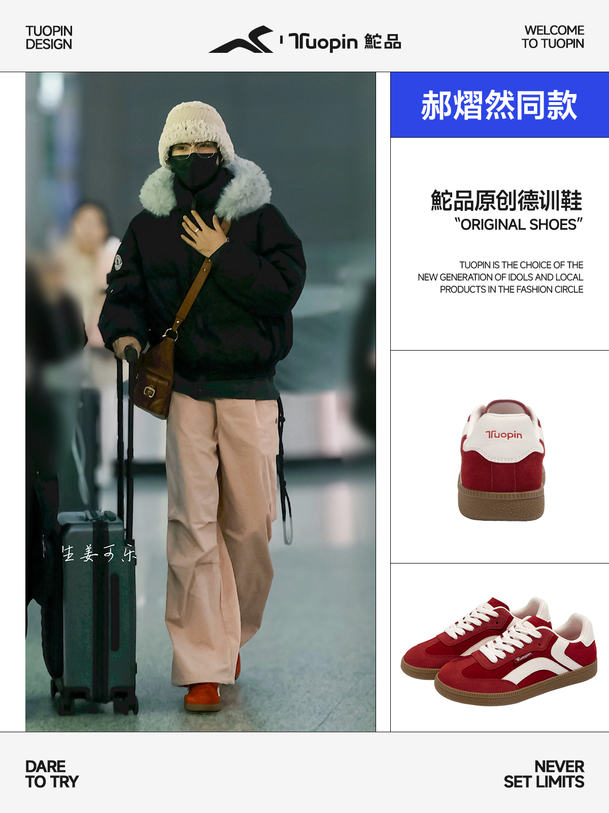 鮀品品牌成立于2010年,多年来深耕休闲鞋领域,于近年推出多款风格不同的原创设计德训鞋,凭借其舒适的穿着感受与休闲百搭的风格深受广大用户喜爱与信任,也深受内娱多位流量艺人的青睐。