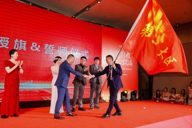 蓝图绘就,战鼓催征。激动人心的授旗仪式中,集团董事长胡玉建依次为集团三个大区及三个创新业务授旗。