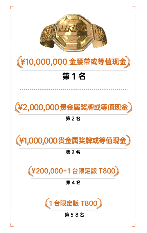 为充分激励全球机器人领域的创新力量积极参与,本次赛事设置了丰厚且多元的奖励体系,覆盖荣誉、奖金、发展机遇等多个维度:进入前4强的队伍均可获得丰厚奖金,其中冠军队伍将斩获重达十公斤、价值约1000万元的专属金腰带奖励;跻身赛事前十六强的队伍,均可获得一台众擎T800人形机器人,助力团队后续技术研发与实践;同时,跻身前八强的所有参赛队伍成员,均可获得众擎机器人专属offer绿色通道,全方位助力参赛团队实现技术突破、成果转化与人才发展。