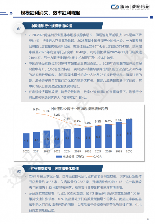 中国连锁产业正站在一个微妙的历史关口。数据不会说谎。2020年至2025年,连锁行业整体市场规模增速从9.8%逐年下滑至6.4%。规模红利正在消退,取而代之的是一个更冷酷的词汇:效率红利。