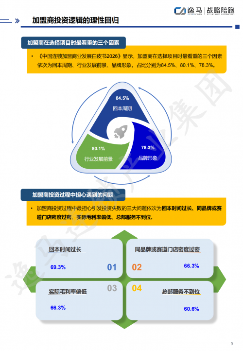 逸马白皮书数据显示,加盟商在选择项目时最看重的三个因素依次为:回本周期(84.5%)、行业发展前景(80.1%)、品牌形象(78.3%)。职业加盟商正在成为主流,他们对品牌方的要求从简单的品牌授权升级为系统化的赋能支持。凭感觉做决策的时代已经结束。