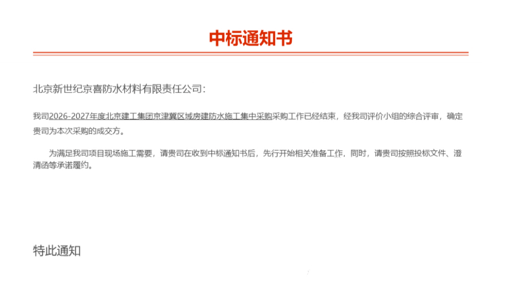 图:京喜防水北京建工集团集采项目中标通知