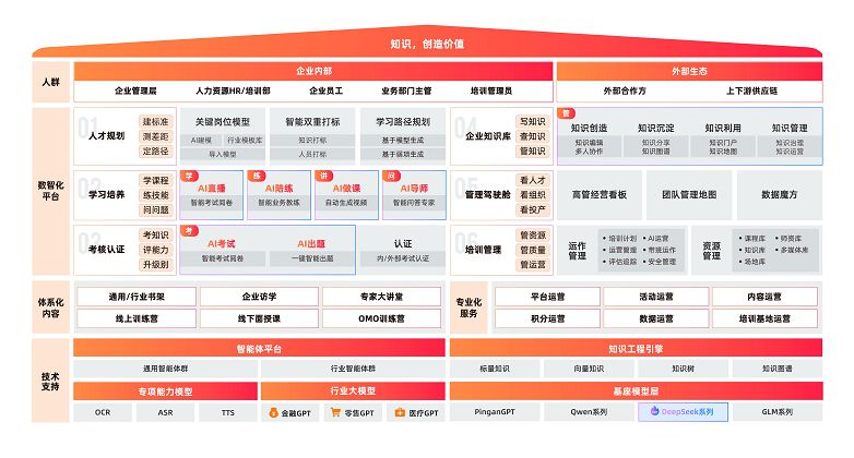 随着2023年大模型技术浪潮的到来,平安知鸟迅速将生成式AI能力与原有企业知识库深度融合,构建可以提供COE生产力的知鸟AI智能体,发布AIGC超级应用,包括AI陪练、AI导师、AI做课等产品,覆盖“学、练、问、考、管”企业培训全流程。2025年,平安知鸟发布AIGC人才培养解决方案,整合DeepSeek大模型技术,开发了覆盖金融、电商等多领域的定制化课程体系。