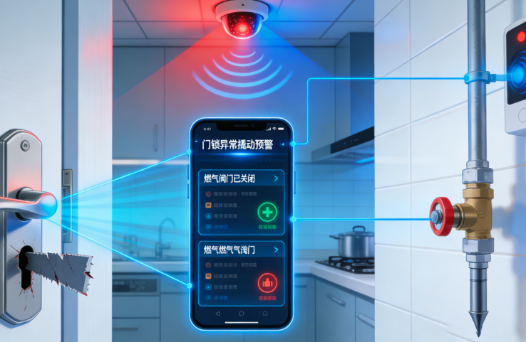 全屋安防联动,形成闭环守护体系。方案支持全屋安防设备互联互通,实现“一处预警、全屋联动”——若门锁被异常撬动,系统立即触发报警,联动室内灯光闪烁、窗帘关闭,震慑不法分子;若检测到燃气泄漏、烟雾超标,立即联动燃气阀门关闭、排风扇开启,同时推送预警信息,最大限度降低风险。此外,安防系统可与居家智能设备联动,主人外出时,系统自动开启布防模式,关闭非必要电器,联动摄像头实时监测;主人归家时,自动撤防,联动灯光、空调开启,兼顾安全与便捷。