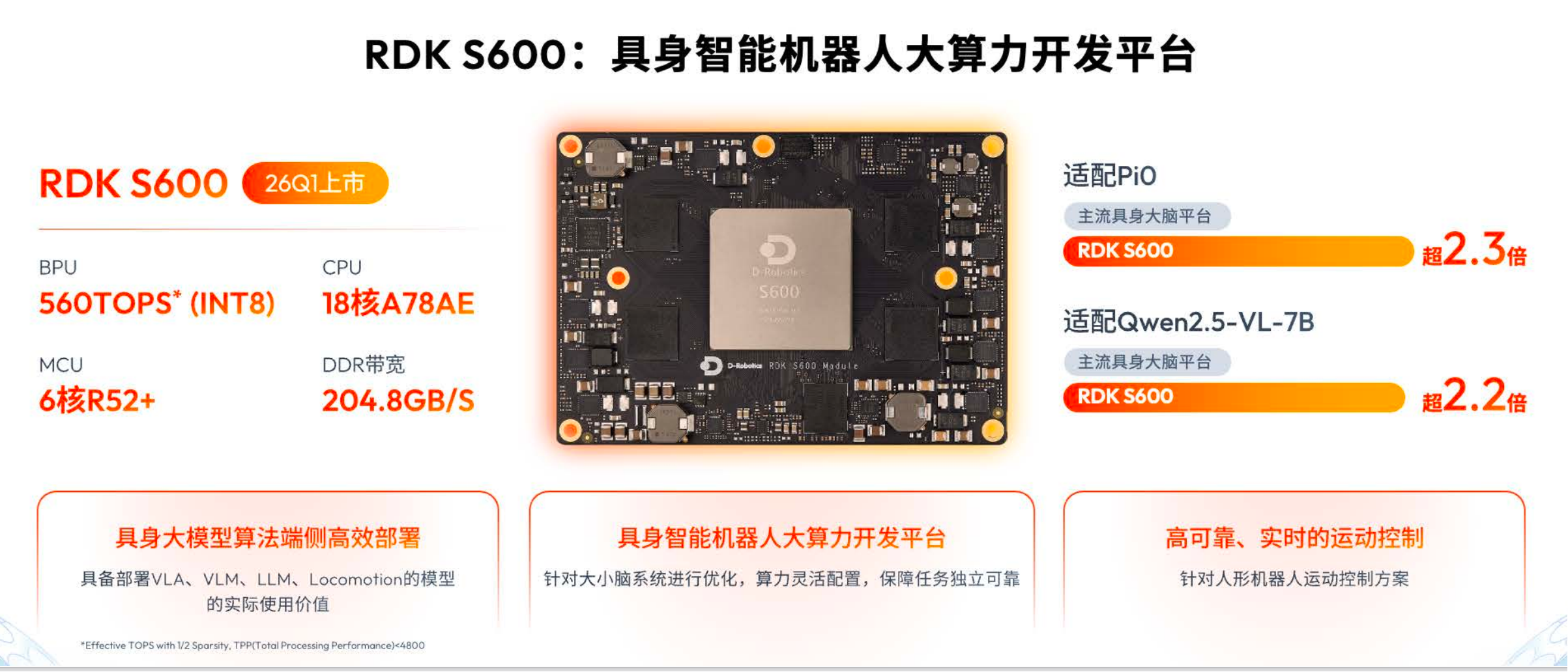2025年11月,地瓜机器人在其开发者大会上揭晓了旗舰级具身智能大算力开发平台S600,并宣布将于2026年第一季度正式发布。这款被业界视为“具身智能核心底座”的产品,拥有560 TOPS(INT8)算力,采用大小脑协同架构设计——大脑配置18核A78AE CPU和自研Nash架构BPU,支持VLA、VLM、LLM、Locomotion等多种具身大模型算法端侧高效部署;小脑配置6核R52+ MCU,专为人形机器人优化,具备高可靠、实时的运动控制能力。
