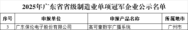 近日,2025年广东省省级制造业单项冠军企业名单已在广东省工业和信息化厅网站完成公示,itc保伦股份凭借核心创新产品“高可靠数字广播系统”成功入选“2025年广东省省级制造业单项冠军企业”!