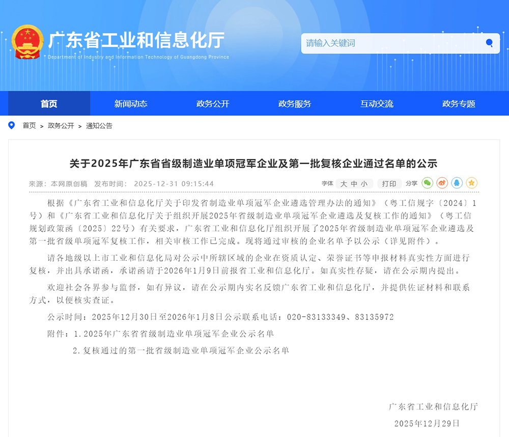 重磅!itc保伦股份成功入选“2025年广东省省级制造业单项冠军企业”!