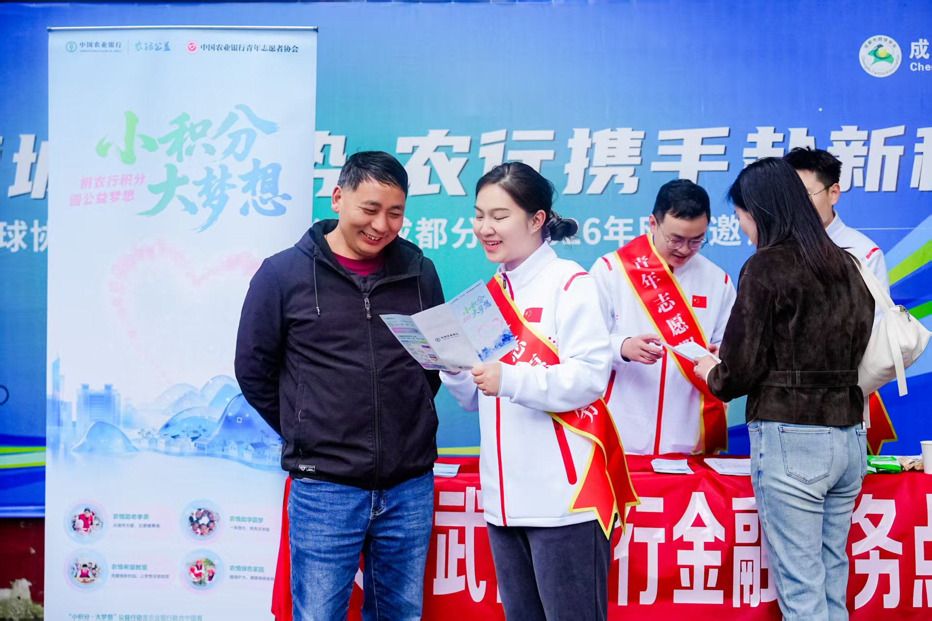 3月14日,农行成都武侯支行青年志愿服务队走进某赛事现场,将公益触角延伸至社会大众。志愿者们搭建专属咨询台,化身公益宣传员与服务专员,一边向过往参赛者、观众发放宣传资料,一边耐心讲解农行积分捐赠的操作步骤、“小积分,大梦想”项目的帮扶领域,让公众清晰知晓闲置积分的公益价值。针对大家的疑问,志愿者们逐一解答,现场演示积分捐赠流程,引导大家轻松参与公益。便捷的参与方式、暖心的公益理念,吸引了现场群众纷纷驻足咨询、主动参与,实现了“金融服务+公益宣传”的深度融合,有效扩大了积分公益活动的社会覆盖面与影响力。