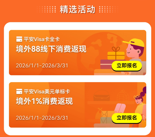 境外信用卡哪个银行的比较好?平安Visa信用卡除了消费88返现优惠,也同步推出消费笔笔1%返现福利,该活动特别适用于小额消费场景的旅客。