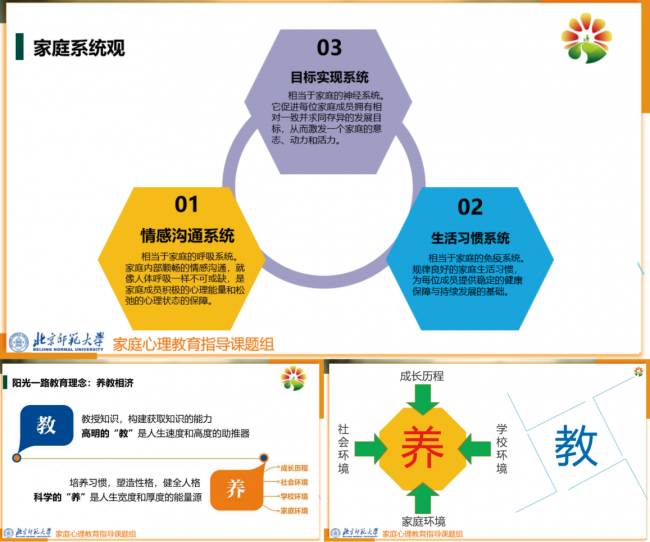 阳光一路教育创始人贾颖华表示,团队多年来坚持聚焦心理健康与家庭心理教育指导、青少年素质能力培养工作,是基于对教育本质的深入学习探究——多数孩子的行为与情绪问题,根源在于家庭关系与互动模式等多维度原生环境的影响。阳光一路教育据此提出的“家庭系统观”和“养教相济”理论,在实践应用中取得了良好效果和广泛认可。“家庭系统观”认为每个家庭都有自己的“呼吸系统”、“免疫系统”、“神经系统”,分别对应家庭成员的情感陪伴和交互模式、学习和生活等行为习惯、相对一致并求同存异的发展目标。“养教相济”中的“教”是外力,是教授知识、构建获取知识的能力,高明的教是人生速度和高度的助推器;“养”是内功,是培养习惯、塑造性格、健全人格,科学的养是人生宽度和厚度的能量源;养教相济,能够更好地以文化人、以德育人,能够在促进成长的同时更好地保障身心健康。未来,在家庭心理教育从业人员培养、教师等相关岗位实务操作能力培训和家长科学养育知识的普及工作上,北京师范大学家庭心理教育指导课题中心将持续投入更大力量。