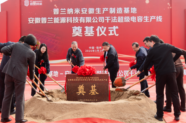 中国·泗县,2026年3月20日 ——今日,天津普兰纳米科技有限公司(以下简称“普兰纳米”)全资子公司——安徽普兰能源科技有限公司投建的“普兰纳米安徽生产制造基地 - 安徽普兰能源科技有限公司干法超级电容生产线”奠基仪式在安徽省宿州市泗县隆重举行。