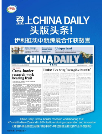 近日,《中国日报》头版头条大篇幅介绍伊利在新西兰的发展成绩。报道高度评价伊利与林肯大学及新西兰科研机构的长期合作,报道认为:伊利大洋洲创新中心是中新合作的“成功实践”,伊利在新西兰的发展是中国企业全球化的“经典案例”。