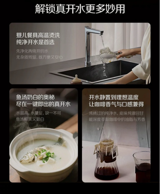 1. 核心卖点:拥有6档温度随心所享(100℃/常温/45℃/55℃/70℃/温热水)。其中黄金热力温区提供4.5L/min的极速温热水,火锅加汤、冲奶泡茶都不用等。