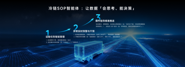 AI Agent:冷链SOP智能体基于整合数据提供主动决策与执行支持,全流程智能管控,让数据 “会思考、能决策”。