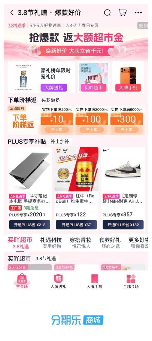 面对节后消费市场调整,分期乐商城顺势捕捉消费重心从家庭集中采购向个人品质升级的转移趋势,围绕“3.8节”推出“3.8礼遇季”专属活动,通过价格直降、满减优惠、超市金返还、分期免息等多元让利举措,覆盖悦己好物、实用好礼、居家换新和春季踏青四大消费方向。其中,数码家电大牌直降千元、美妆护肤低至3折,创新推出的超市金阶梯返还、每日盲盒抽奖等活动,让消费者在享受品质消费的同时兼顾日常刚需补给;同时,“甄品惠”频道满减、直播间专属返现、最高12期免息分期等政策,实现对不同消费偏好人群的全面覆盖,有效助力节后悦己消费升级。