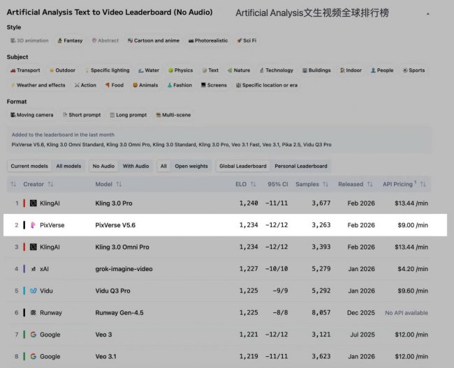 根据全球权威AI评测机构Artificial Analysis 截至2026.2的实时排名,PixVerseV5.6在文生视频与图生视频领域均位列全球第二,稳居第一梯队。