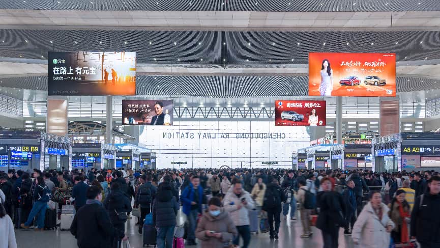 与互联网广告可被跳过、户外大牌仅能匆匆一瞥不同,高铁灯箱广告依托候车大厅、进出站通道等必经动线,形成了"封闭空间内的稳定曝光"。大尺寸、高亮度的灯箱画面在相对单一的信息环境中,天然具备视觉优先级,能够以较低的认知成本完成品牌信息的传递。