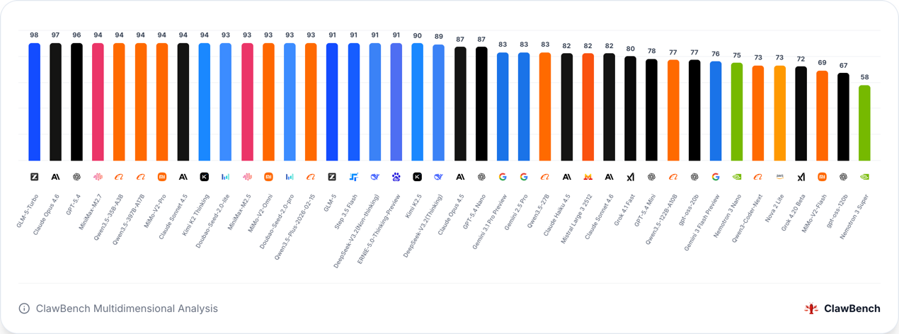 在本次发布的核心能力CLAW SCORE榜单中,北京企业实现历史性领跑,在全球头部阵营中形成集群式优势。CLAW SCORE以模型全场景评测任务的完成率为核心指标,分值越高代表模型的综合任务解决能力越强。其中,智谱旗下GLM-5-Turbo模型以93.9的高分登顶全球榜首,成为当前全球智能体能力最强的大模型;同属智谱的GLM-5模型以91.7分位列榜单第6位。字节跳动旗下Doubao-Seed-2.0-lite模型以93.1分稳居全球第二,与榜首仅相差0.8分,是全球仅有的两款评分突破93分的模型之一。小米集团旗下MiMo-V2-Omni模型以91.2分位列榜单第9位,成为消费电子企业入局通用人工智能领域的标杆成果。三家北京企业共计4款模型跻身全球前十,在榜单头部阵营中占据近半席位,全面超越OpenAI GPT-5.4、Anthropic Claude Opus 4.5等海外顶尖模型,实现了中国AI企业在全球智能体评测领域的全面领跑。
